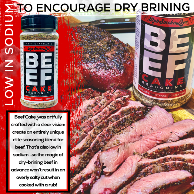 So that's why BEEF CAKE was crafted low in sodium-to allow for dry brining. After brining, generously apply our rub & cook for elite results! If you don't have time to brine, just remember to lightly salt to taste.