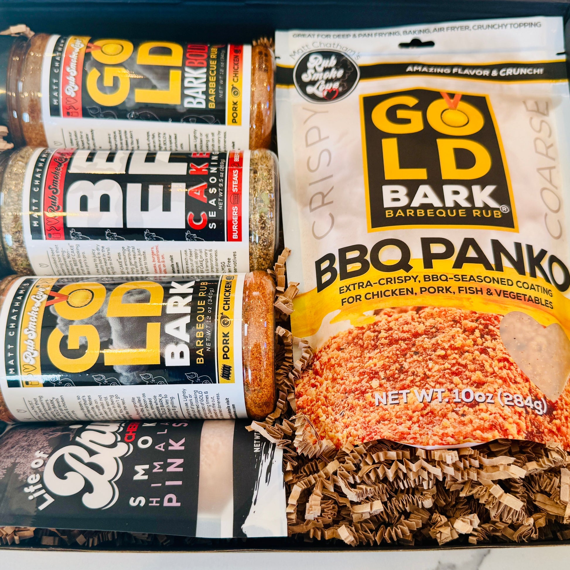 The perfect gift to share the unmatched experience of the Rub Smoke Love lifestyle with that food lover in your life! Three oversized bottles of our kitchen cornerstone meat rub offerings (Beef Cake, Gold Bark & Gold Bark Bold); one 10 oz resealable package of Gold Bark BBQ Panko; one 5 oz resealable bag of delectable "Life of Brine" cherry wood smoked Himalayan pink salt.
